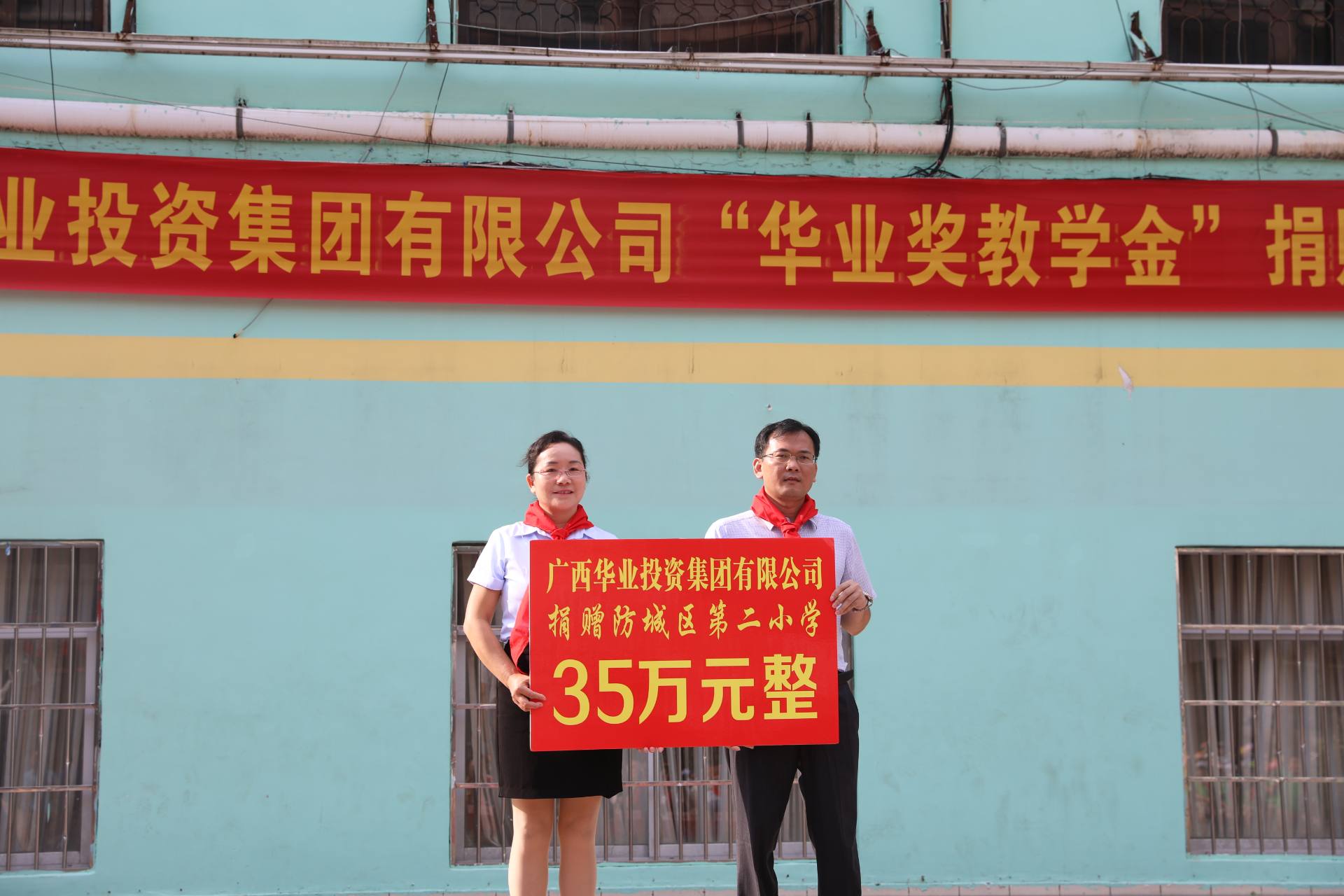 廖人興副總裁代表華業(yè)集團(tuán)向防城區(qū)第二小學(xué)捐贈獎(jiǎng)教學(xué)金35萬元