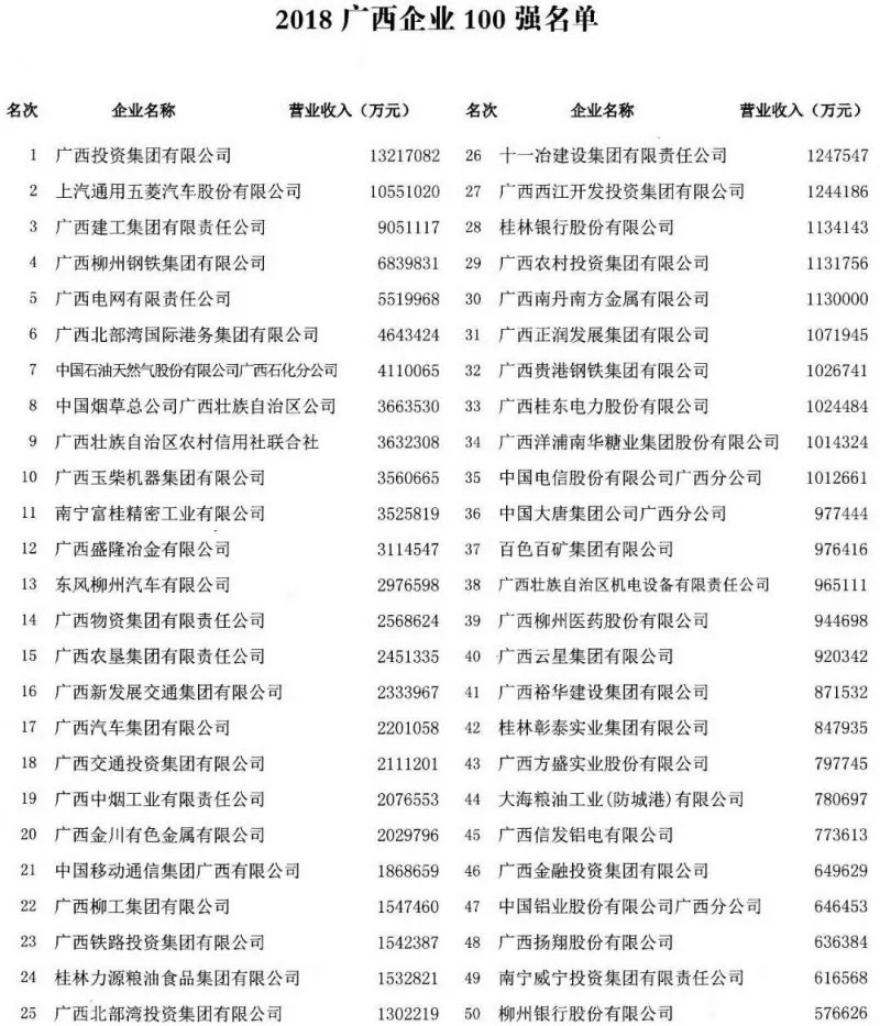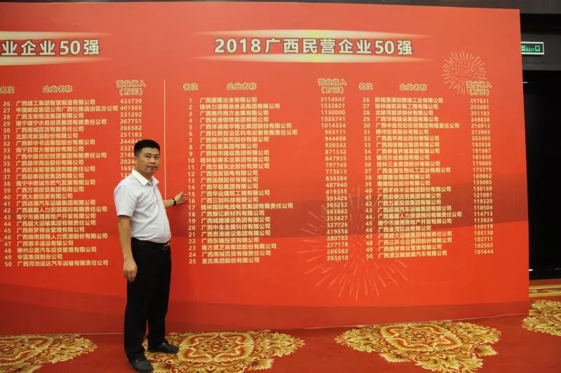 大會揭曉了2018年廣西企業(yè)100強,以及廣西民營企業(yè)50強榜單。廣西投資集團有限公司、上汽通用五菱汽車股份有限公司、廣西建工集團有限公司位列廣西企業(yè)100強榜單前三甲。廣西華業(yè)集團旗下子公司廣西華業(yè)建筑工程有限公司以營業(yè)收入41.9億元,位列廣西百強企業(yè)第57名,并躋身廣西民營企業(yè)50強第15強。