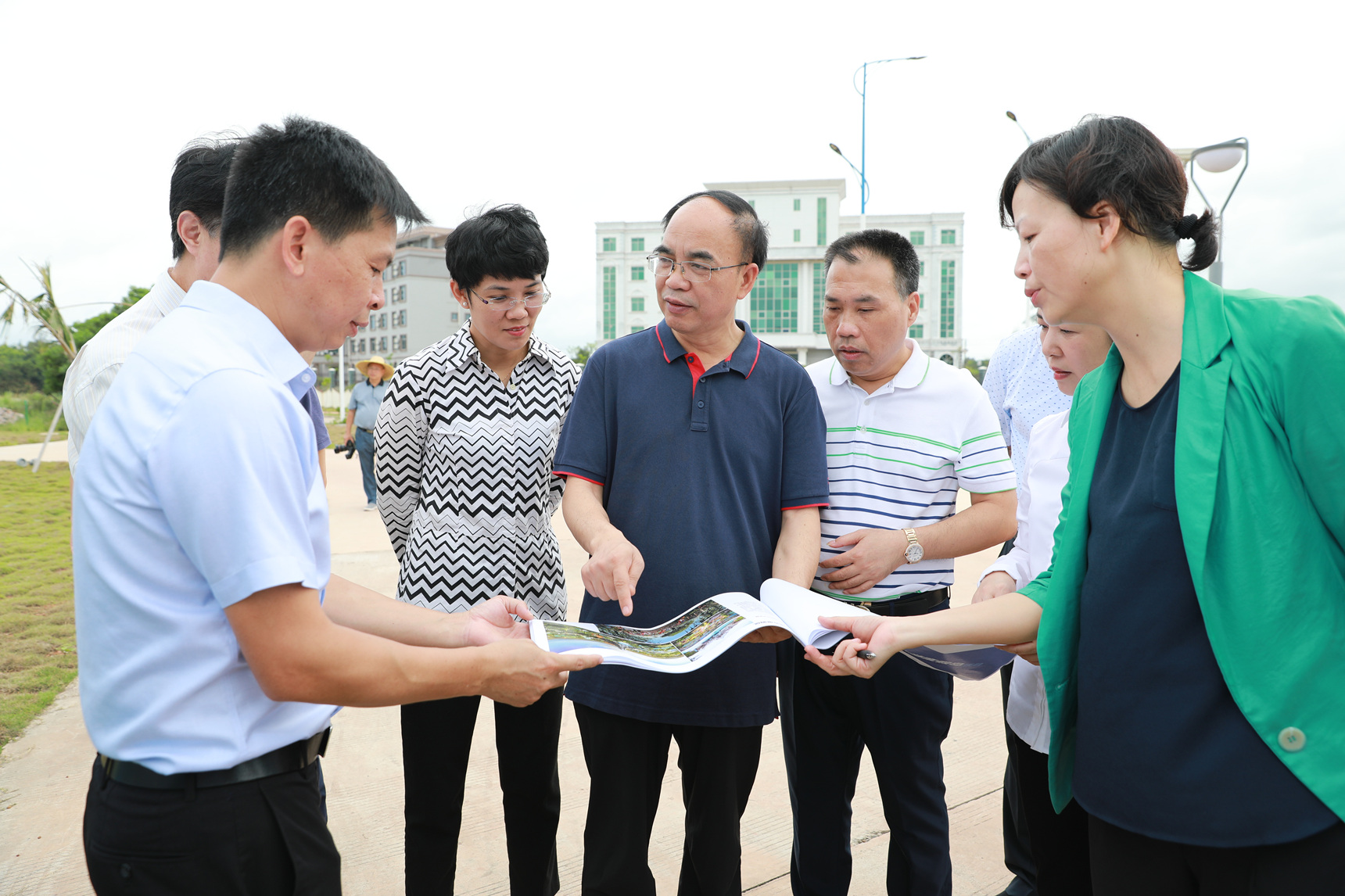 陳潔副部長(前排右三)、溫達勤巡視員(前排左二)在調研現(xiàn)場聽取項目建設情況匯報