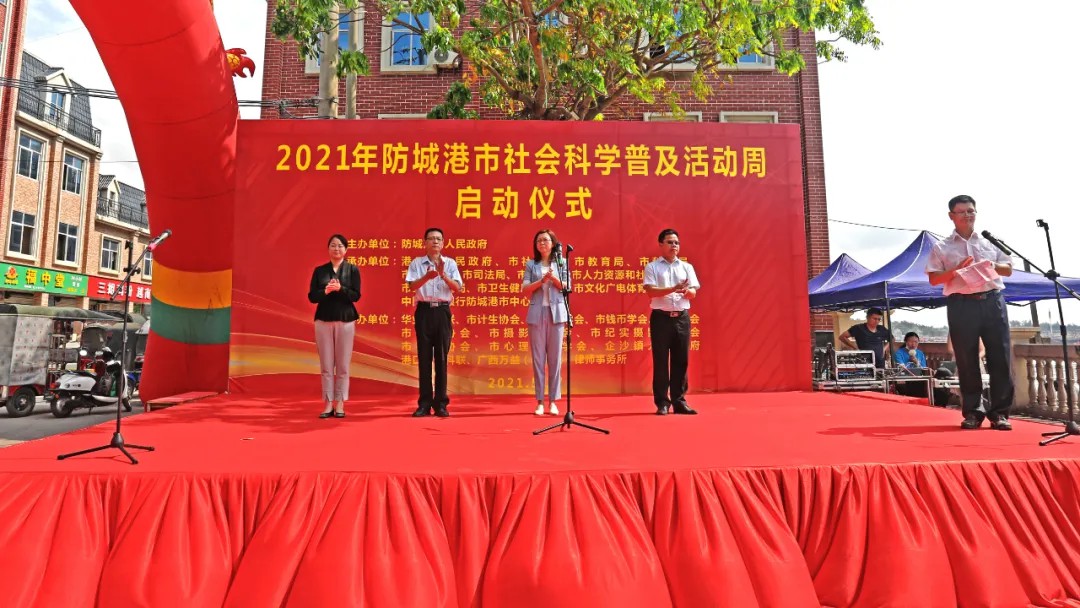 2021年5月17日,防城港市2021年社會(huì)科學(xué)普及周活動(dòng)啟動(dòng)儀式在港口區(qū)企沙鎮(zhèn)朝陽(yáng)路三角塘廣場(chǎng)順利開(kāi)幕!防城港市人民政府副市長(zhǎng)于華等領(lǐng)導(dǎo)出席了啟動(dòng)儀式,并向華僑學(xué)校等有關(guān)單位、學(xué)校、群眾代表贈(zèng)送科普書(shū)籍。廣西華業(yè)投資集團(tuán)有限公司社會(huì)科學(xué)界聯(lián)合會(huì)(簡(jiǎn)稱(chēng)“華業(yè)社科聯(lián)”)等近20家會(huì)員單位踴躍參加了啟動(dòng)儀式及普及周活動(dòng)。
